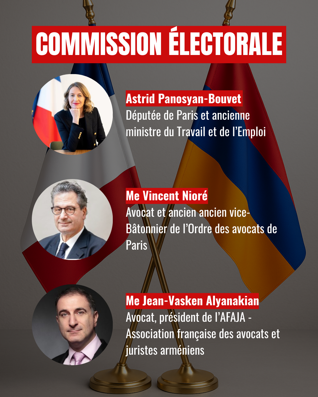 Le Bureau national du CCAF a l’honneur d’annoncer que Madame Astrid Panosyan-Bouvet, députée de Paris et ancienne ministre du Travail et de l’Emploi, a accepté de présider la Commission électorale chargée de garantir la régularité du scrutin des 6, 7 et 8 février prochains.